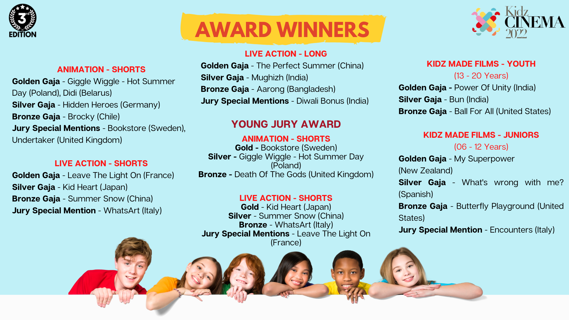 It will be a 7-day event starting on the Universal Children's Day, which is celebrated on 20th November each year to promote international togetherness, awareness among children worldwide, and improving children's welfare. KidzCINEMA 2022 film Festival will open on 20th November 2022 with main activities running for 7-days. Gaja Awards will be announced on 30th November 2022 and the online screening of the selected films will be available for a period of one-month starting from the festival opening date. We also aim to have physical screenings of the winning films in various schools and colleges during the festival period and/or later.