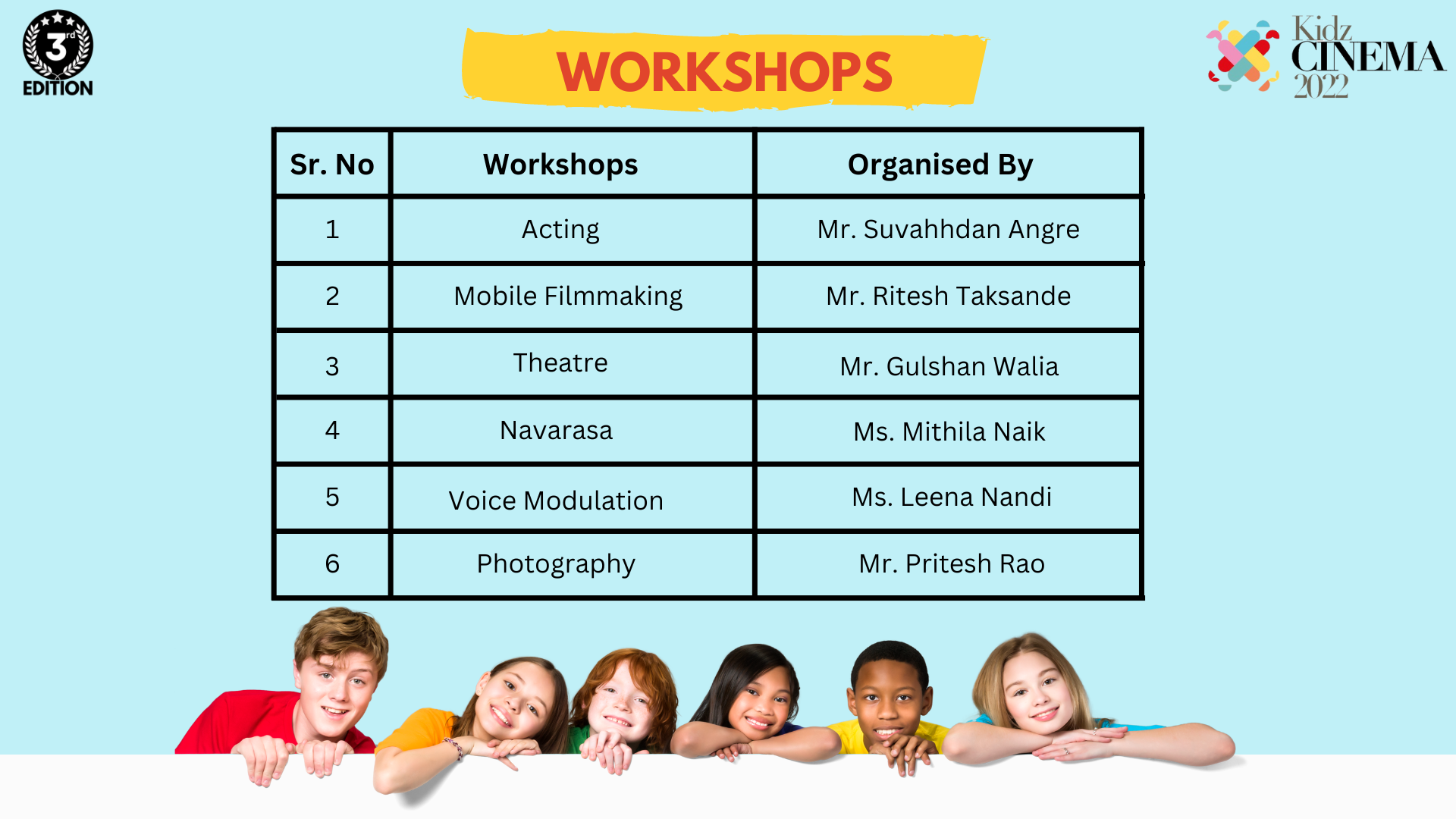 Cinema is the most powerful medium of creative expression globally. We are back with the 3rd edition of KidzCINEMA. Children from all over the world will get to watch movies, interact with directors, actors, and also participate in various LIVE workshops around scriptwriting, animation, and filmmaking.