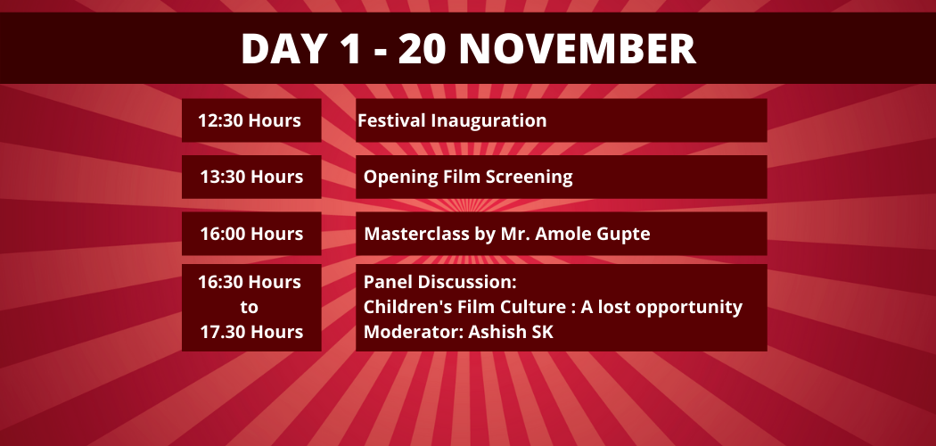 The very first edition of this Children’s Film Festival "KidzCINEMA2020" will be delivered in a completely online environment to the global audience. It will give opportunities to young kids as well as teenagers to watch movies from across the globe and to know more and learn about the process of filmmaking. Children will get to watch movies, interact with directors, actors, and also participate in various LIVE workshops on scriptwriting, animation, and filmmaking. It will be a 3-day event starting on the Universal Children's Day, which is celebrated on 20th November each year, to promote international togetherness, awareness among children worldwide, and improving children's welfare. The Festival will have its opening ceremony on 20th November 2020 while the closing ceremony will be organised on 22nd November 2020.