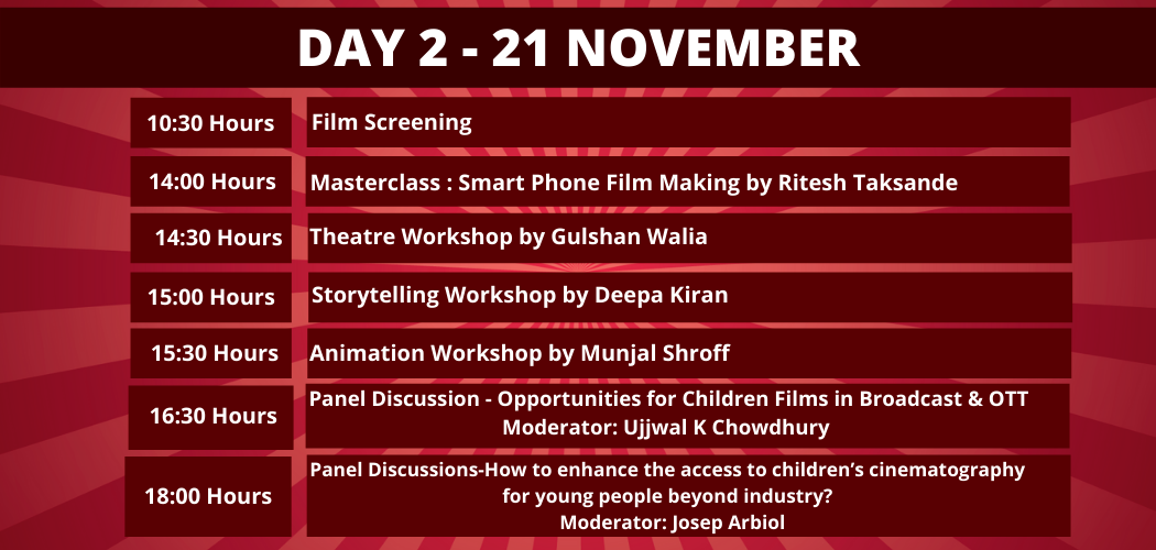 The Festival will be relayed on ZOOM, a videoconferencing platform. This will further be made available on all social media platforms of the festival such as Facebook LIVE, YouTube, IGTV, etc. We are exploring the possibility of a possible tie-up with a children’s TV channel for beaming the festival LIVE in India and abroad. Besides, we will have an outreach to various chains of schools for involving their students in participating in the festival from the perspectives of submitting the film entries and exhibition as well.